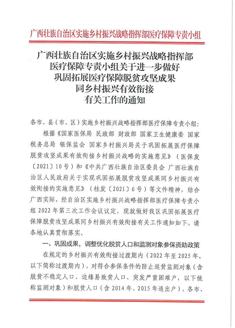 广西壮族自治区实施乡村振兴战略指挥部医疗保障专责小组关于进一步做好医疗保障脱贫攻坚同乡村振兴有效衔接有关工作的通知 来源: 发布时间:2022-09-08 08:51:45 浏览次数: 次 【字体:小 大】 分享到: 【打印正文】