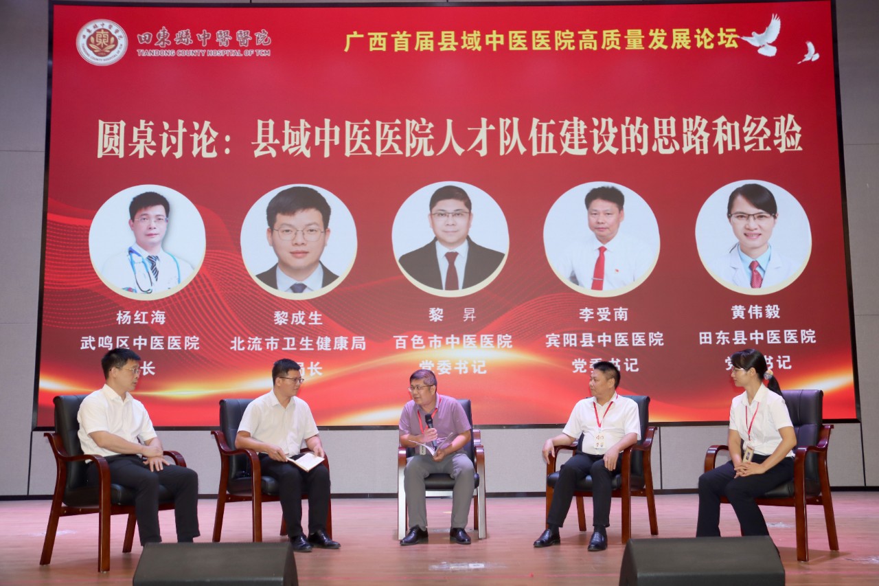 高峰对话圆桌交流:以“县域中医医院人才队伍建设的思路和经验”为主题展开交流。由百色市中医医院党委书记黎昇主持,武鸣区中医医院院长杨红海、北流市卫生健康局副局长黎成生、宾阳县中医医院党委书记李受南、田东县中医医院党委书记黄伟毅作为交流嘉宾进行了发言。